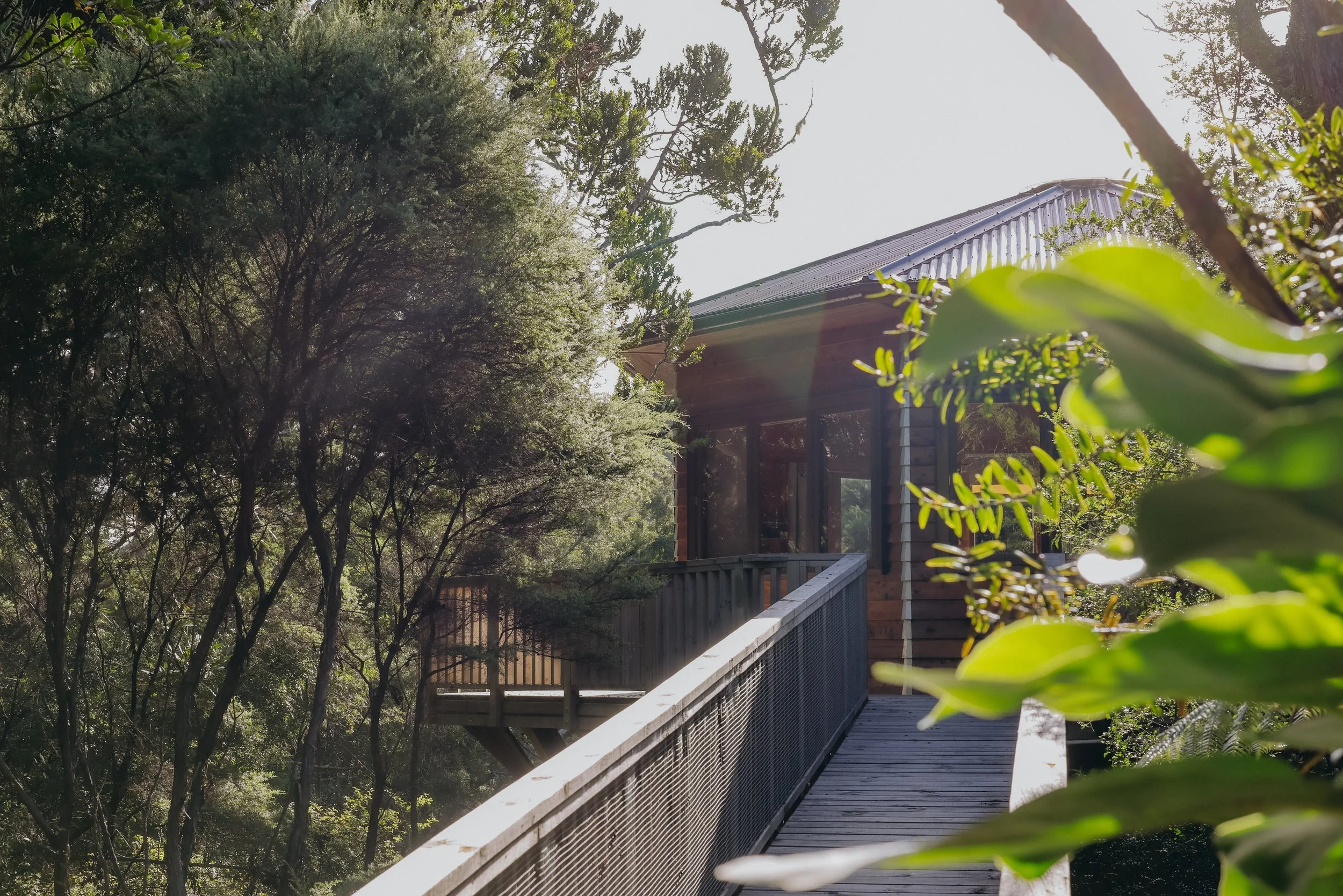 Wander down the bush path to catch sight of the treehouse that rises on a solid central base, standing sentry-like over the surrounding kauri, nikau, manuka, and many other specimens of New Zealand native bush. Take the boardwalk to this stunning octagonal treehouse, step inside to marvel at the abundance of space and the magnificent untreated timber ceiling rising to a soaring height producing authentic woody aromas.